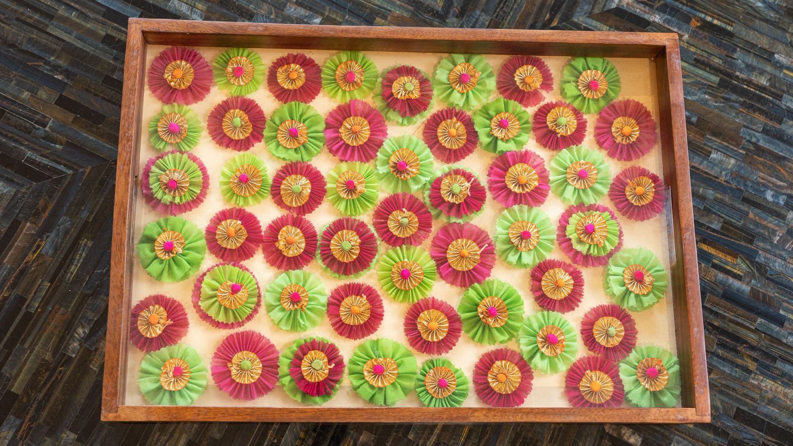 Service size tray with beautiful handmade fabric and gota flowers and acrylic on top